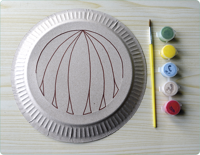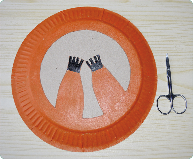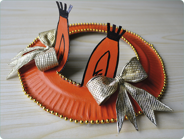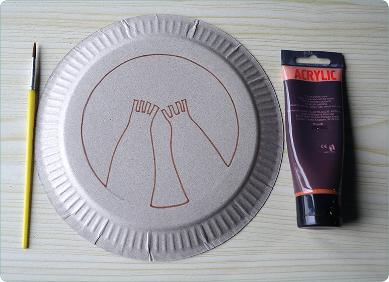 На зовнішній стороні паперової тарілки діаметром орієнтовно 21 см намалюйте вушка білочки, як показано на фото. Відтак зафарбуйте краї тарілки й самі вушка в оранжевий колір. Скористайтеся для цього акриловою фарбою, але не надто розводьте її водою, щоб картон не деформувався від вологи. Китички на вушках пофарбуйте в чорний колір.