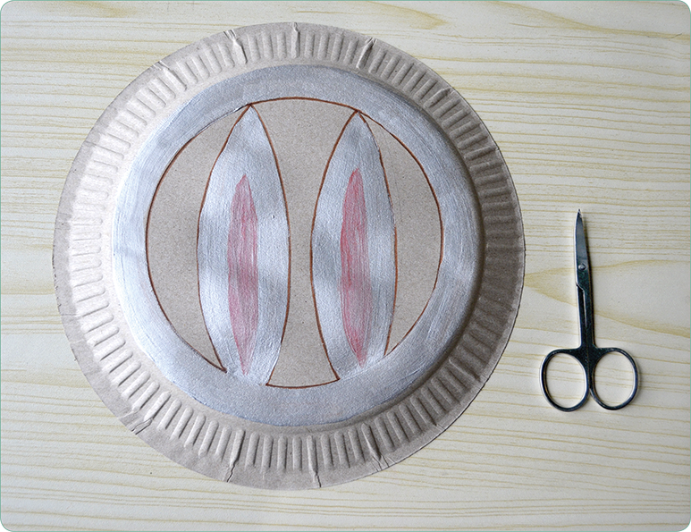 Зачекайте, доки фарба повністю висохне.отім маленькими ножицями виріжте по контурах незафарбовану частину всередині тарілки. За допомогою тоненького пензлика чорною фарбою наведіть контури й промалюйте внутрішню частину вушок.