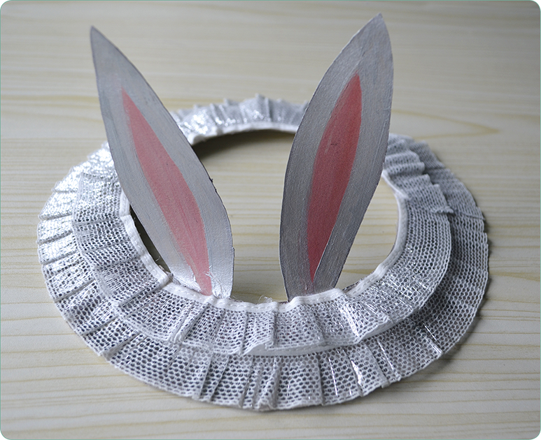 У такий самий спосіб можете виготовити й капелюшок у вигляді заячих вушок. Для цього самі вушка пофарбуйте в сріблястий колір із рожевими серединками, а краї тарілки обклейте мереживом чи задекоруйте іншою тканиною.