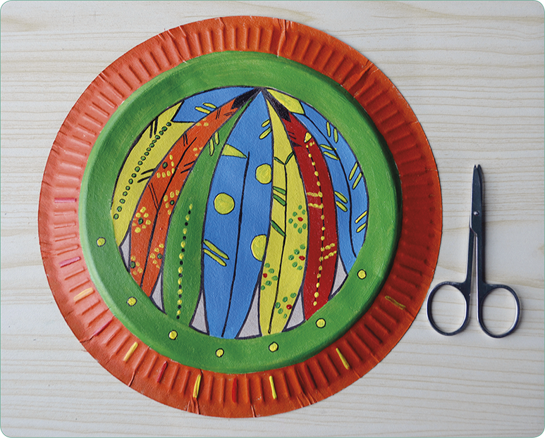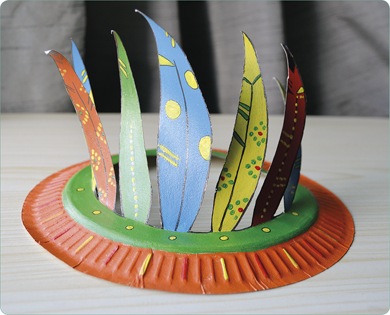 Посередині тарілки із зовнішньої сторони намалюйте контури пір’їн, як показано на фото. Після цього розмалюйте заготовку: краї майбутнього капелюха, приміром, пофарбуйте в оранжевий і зелений кольори, а картонні пір’їни — у будь-який, що до вподоби. За допомогою тоненького пензлика нанесіть на «пір’їни» різноманітні візерунки. Тут є де розгулятися фантазії.