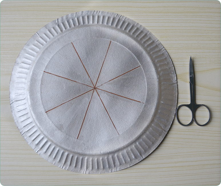 Пофарбуйте тарілку ззовні у сріблястий колір. Зачекайте, доки висохне фарба. Після цього за допомогою лінійки розграфіть умовний круг на вісім секторів і ножицями акуратно розріжте їх по контурах до основи. Загніть кожен сектор назовні, як показано на фото.