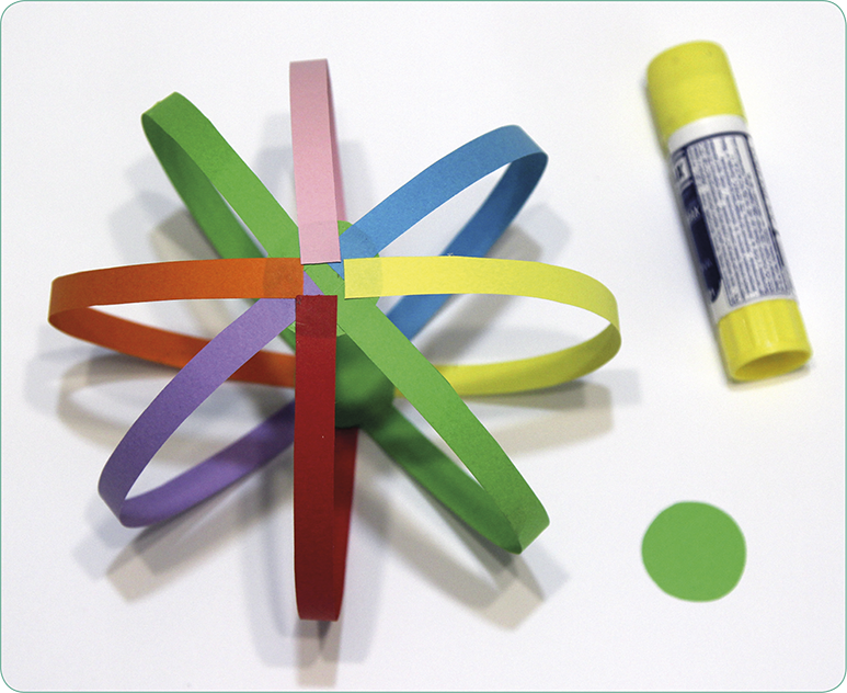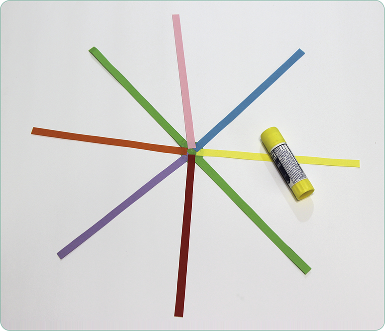 Відтак візьміть один кружечок і приклейте до нього по колу кінчики всіх восьми смужок так, щоб вони нагадували промінчики сонця. Зверху на перший приклейте другий кружечок, щоб він закривав місце з’єднання. Після цього вільні кінчики смужок зберіть і приклейте на третій кружечок, як показано на фото. Поверх них прикріпіть четвертий кружечок. У результаті має утворитися щось схоже на легку паперову кульку.
