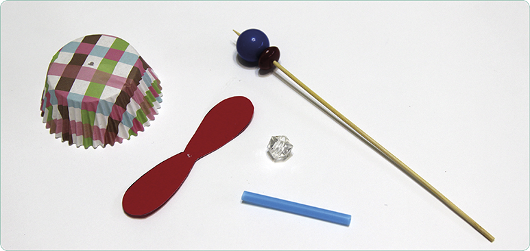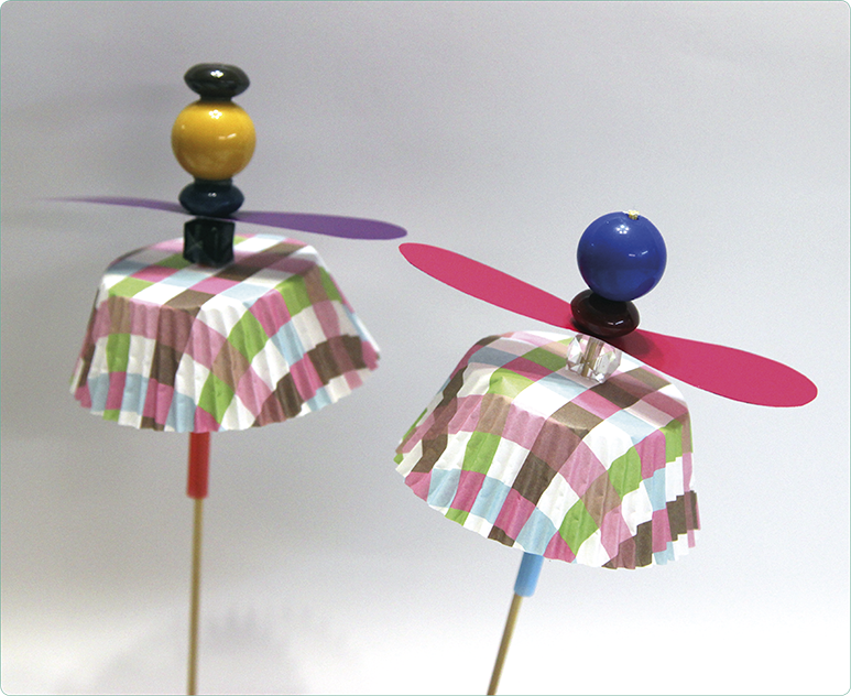 Спочатку надіньте на кінчик шпажки круглу декоративну намистину, яка виконуватиме роль голівки. Якщо отвір намистини доволі великий і вона сковзає по шпажці, закріпіть її краплею клею. Потім нанижіть на вісь ще дві намистини різної форми, які будуть за тільце, а поміж ними вставте пропелер — ручки-крильця. Його виріжте із двостороннього кольорового картону. Після цього одягніть лялечці спідничку — паперову формочку для випікання кексів, у якій заздалегідь зробіть отвір. Насамкінець надіньте на шпажку відрізаний шматочок коктейльної соломинки, який зафіксуйте під спідничкою клеєм.