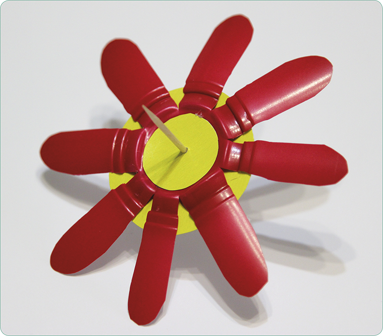 Виготовити таку вертушку надзвичайно легко. Для цього просто нанижіть всі необхідні деталі на вісь — дерев’яну шпажку.