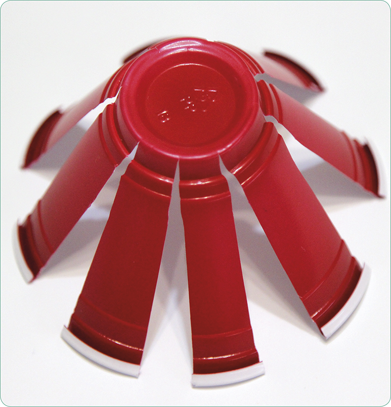 Невелику дзиґу можна виготовити зі звичайного одноразового пластикового стаканчика. Для цього розріжте його стінки по висоті на вісім однакових смужок, залишивши дно цілим. Потім притисніть заготовку до стола внутрішньою стороною, аби вона стала пласкою.