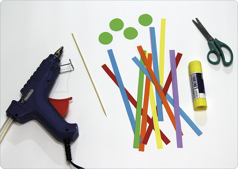Для того щоб створити вертушку-веселку, спочатку підготуйте необхідні паперові деталі. Із кольорового двостороннього паперу виріжте чотири кружечки діаметром 3 см і вісім смужок різних кольорів завдовжки 20 см і шириною 1 см.