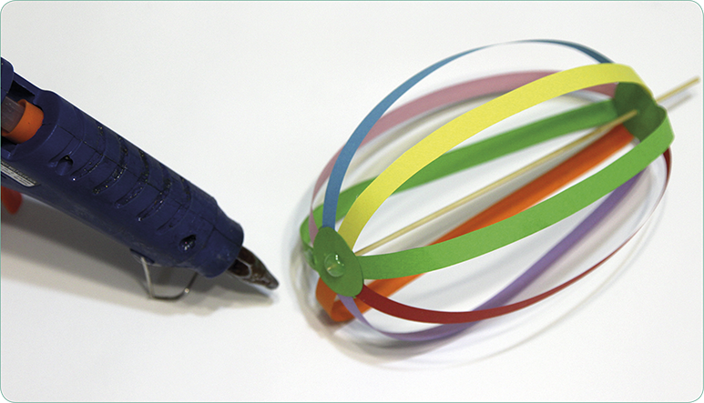В утворену «кульку» вставте вісь. Щоб спростити цей процес, спочатку за допомогою шила1 зробіть невеликі отвори в центрі кожного з кружечків, які тримають смужки. Потім у отвори гострим кінчиком вперед вставте дерев’яну шпажку. Верхня частина іграшки під час гри не повинна рухатися. Тому зафіксуйте кінчик шпажки, який визиратиме назовні, краплею гарячого клею. Нижня частина «кульки», навпаки має бути добре рухома. Тож акуратно покрутіть шпажкою, щоб зробити отвір в нижньому кружечку більшим.