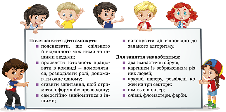 Обговорення: Із чого починається знайомство? Чому кожній людині потрібне ім’я, а кожній речі — назва? Хто дає людині ім’я? Хто вигадує назви різним речам? Чи є речі без назви? А ім’я мають лише люди? Коли та як люди дізнаються імена інших людей? Чи можна сказати, що ми з вами знайомі? Чому? Кого ми називаємо знайомими? А незнайомцями?