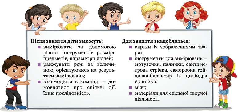 Спільна діяльність «Проводимо вимірювання».Варіант 1. Вихователь нагадує дітям про гру, у якій вони шукали речі-рекордсмени. При цьому зауважує, що раніше вони визначали розміри речей «на око». Тепер же він пропонує їм виміряти кожну річ, а дані зафіксувати. Діти об’єднуються в команди. У кожній команді вони обирають, хто буде проводити вимірювання, хто малюватиме річ, хто фіксуватиме дані. Усю зібрану інформацію команди занотовують кожна на своїй картці. Потім прикріплюють ці картки на спільний аркуш, щоб утворився колаж. Насамкінець поряд зі своїми картками на колажі діти малюють символьні позначки, що вказуватимуть на параметри, за якими вони проводили вимірювання: висота, ширина, довжина тощо.